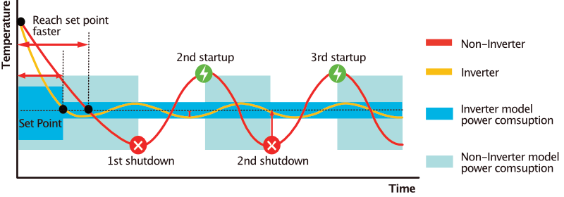 Со класичните климатизери, воздухот се разнесува со полна моќност и тие имаат само две состојби, т.е. нивниот мотор може да биде или вклучен или исклучен. Понапредните климатизери користат инвертер, што значи дека тие имаат контрола на брзината на моторот на компресорот со цел да се регулира протокот на фреон низ системот. Како што се постигнува поставената температура, притисокот во системот се намалува. Брзината на моторот на компресорот се менува електронски и се прилагодува на реалните услови, што доведува до фактот дека климатизерот може да работи на температури далеку под 0 ° Целзиусови. Ваквата контрола на оптималниот проток на воздух резултира со забележително помала потрошувачка на електрична енергија, подолг век на траење на уредот, пониски трошоци за одржување и значително подобри перформанси во зима.