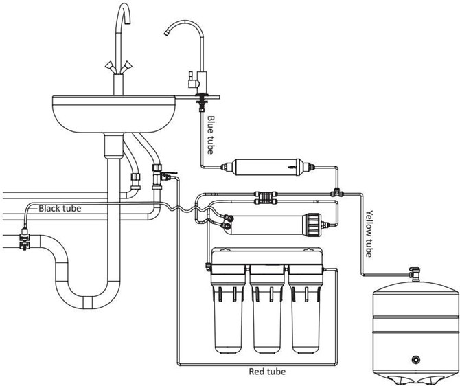 Водата за напојување прво поминува низ три пред-филтри. Овие пред-филтри се наменети за отстранување на механичките нечистотии од вода (‘рѓа, песок, тиња), како и остаток на хлор, органски и органохлоридни соединенија.