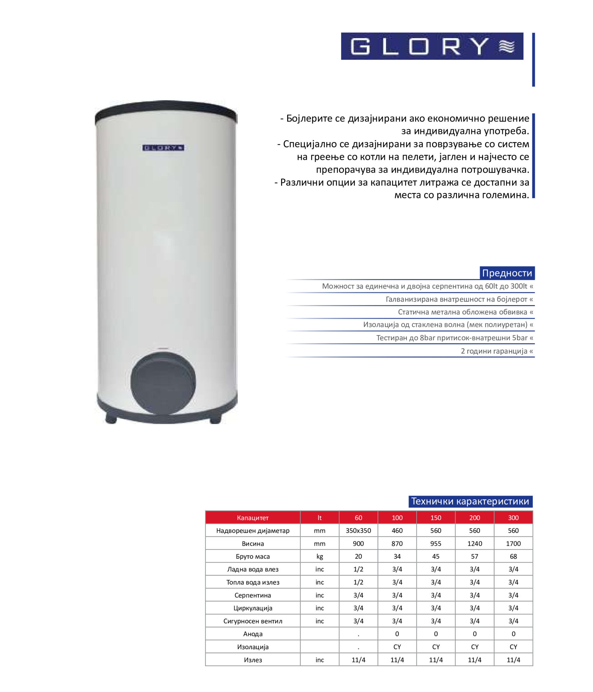 Бојлер 300 литри со 2 изменувача Glori