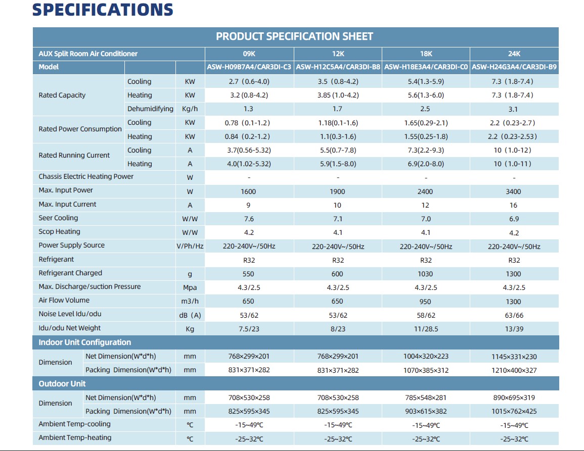 AUX C series split инвертер системите се одликуваат со неверојатна издржливост и висока флексибилност. Широк дијапазон на издржливост при променлив напон од 125-265V и специјалните заштити на електронските компоненти допринесуваат за сигурна и долгогодишна работа на клима уредите.